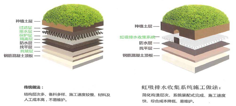 的收集水進(jìn)行二次利用的系統(tǒng)。該系統(tǒng)打破了傳統(tǒng)雨水收集系統(tǒng)只能收集地表水及部分地區(qū)滲入水的詬病,將地表水、滲入水統(tǒng)統(tǒng)收集,充分利用珍貴的大自然資源。并且能夠保持屋面水位處于較低水平,保持土壤的透氣性及透水性,保證植物根系的正常生長。并可作為防水層的柔性保護(hù)層,替代傳統(tǒng)的水泥保護(hù)層,大大降低工程造價(jià)。雙利虹吸排水系統(tǒng)尤其適用于頂板面積較大放坡困難、降雨天氣多的地區(qū)。